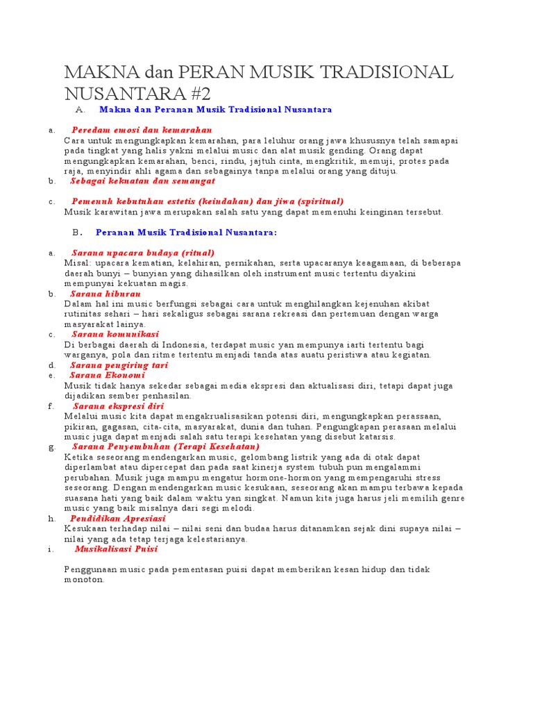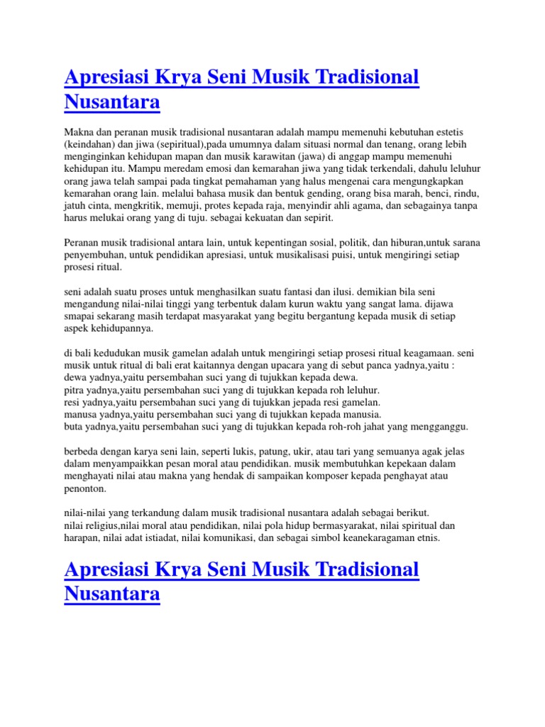 Terbentuknya negara kesatuan indonesia ini juga. Menghibur diri salah satu hak asasi setiap manusia musik contohnya. Musik tradisional memiliki makna khusus bagi daerah pemiliknya, yaitu makna religius dan makna hiburan. Musik untuk ritual di bali. Music shalawatan merupakan music perkusi terbang yang dipukil bergantian dengan sair dan puisi yang dilagukan dengan irama arab atau jawa. Musik ini berkembang di (ndonesia sekitar tahun 1=52</b>an dan banyak digemari masyarakat khususnya kaum muda atau rema$a.salah satu ciri musik pop adalah penggunaan ritme yang terasa bebas dengan mengutamakan permainan drum dan gitar bass. Makna musik non tradisional nusantara ialah jenis musik yang menggunakan peralatan dan disajikan dengan pengaruh mancanegara (luar negeri). Makna bait keenam, manusia adalah mahluk yang paling mulia diciptakan oleh allah yang dikarunai cipta, rasa, dan karsa. Musik nusantara adalah musik daerah (musik tradisional) yang ada di indonesia yang b. Pada hakekatnya wawasan nusantara adalah cara pendang yang utuh serta menyeluruh dalam lingkup nusantara dan demi kepentingan nasional konsep ini mengandung makna bahwa negara ini terdiri dari berbagai komponen banga atau suku. Sebagai batasan lokalitas dan komunitas nilai yang dekat dengan lokalitas 17. Musik nusantara, kabupaten trenggalek, jawa timur. Erat kaitannya dengan upacara yang di sebut panca.